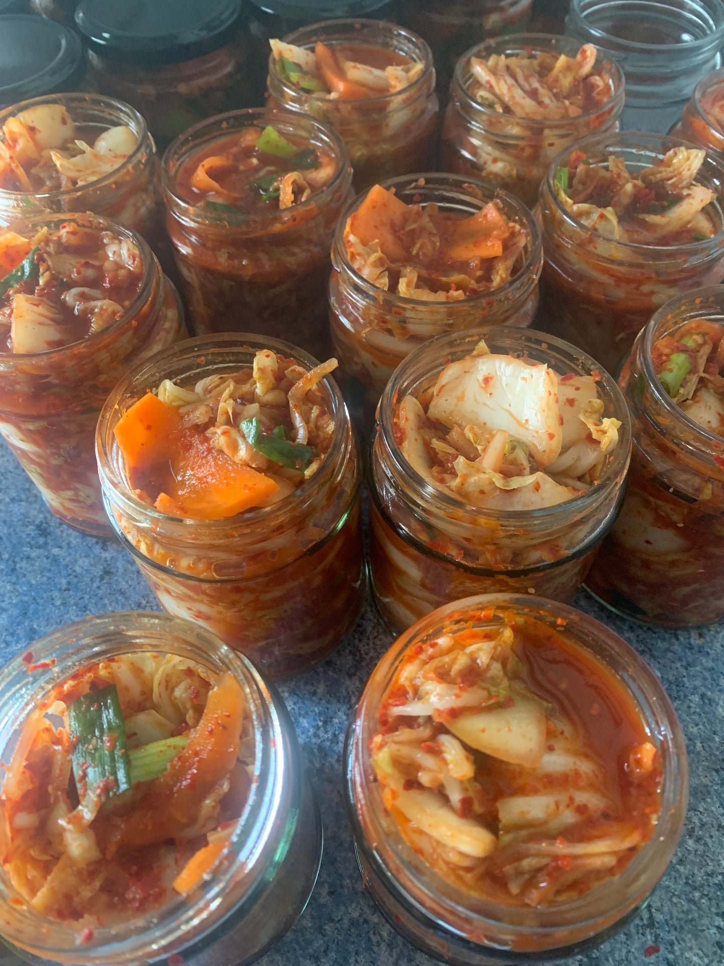 | Chinese cabbage, Korean sea salt, water, pear puree, mu( Daikon), gochutgaru ( Korean chilli powder), garlic, and ginger. Fish sauce, Kelp seasoning ( toasted kelp powder, toasted shitake mushroom ) |